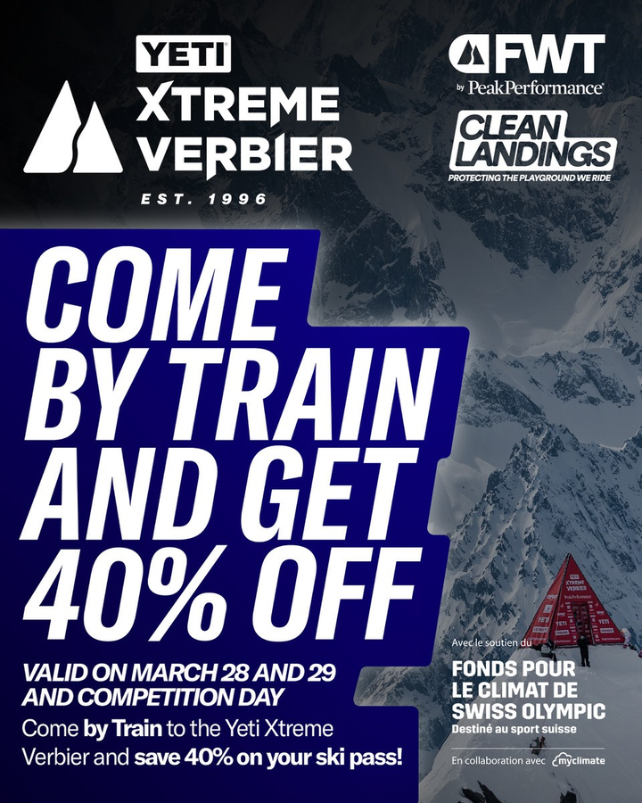 Travel by train to Le Châble for YETI Xtreme Verbier on 28 March, 29 March and competition day, and get 40% off your day pass.